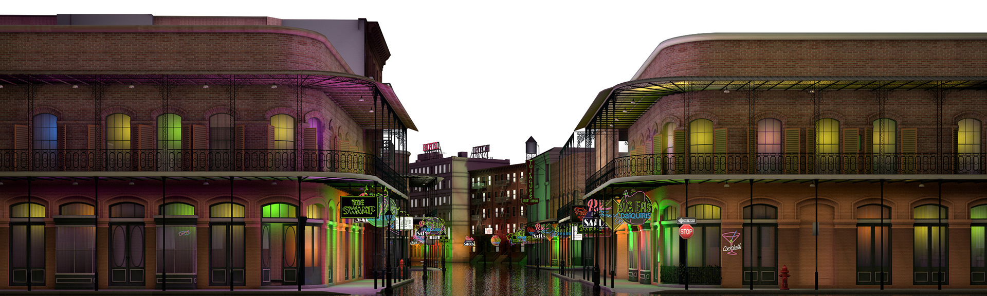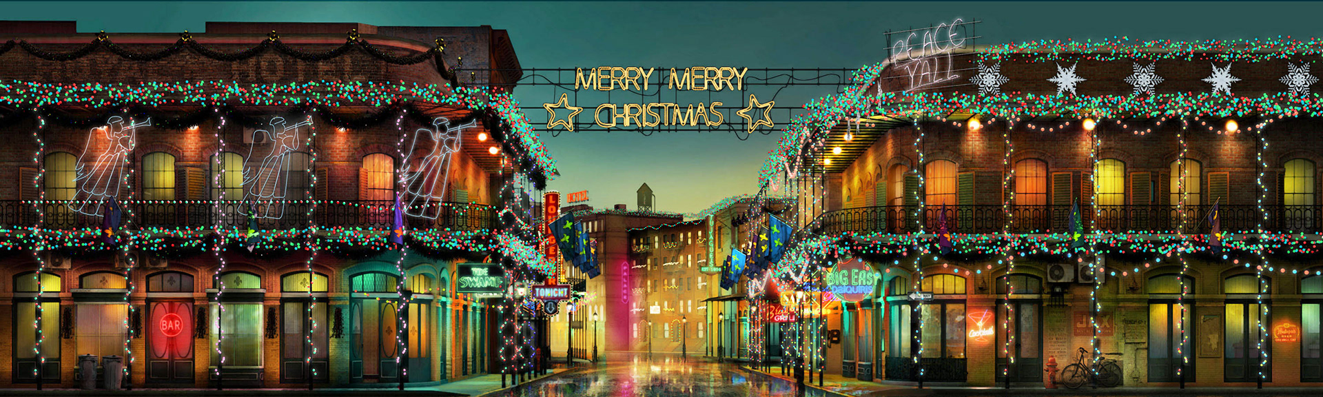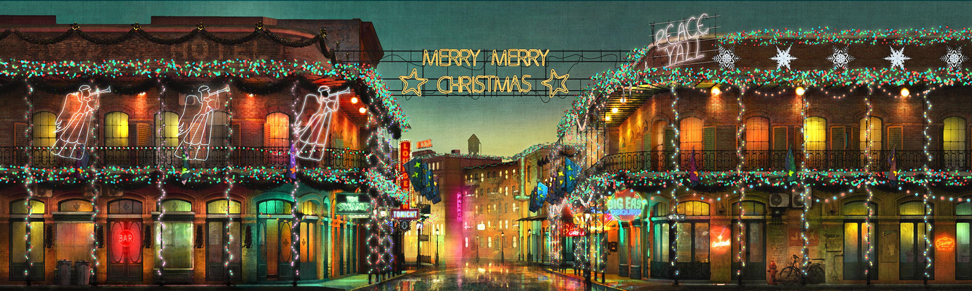 I was asked by the motion graphics company SHOP to work on a visual to be part of the stage projections for the singer John Legend's Christmas Tour. The scene was a street in New Orleans and I worked over a 3d computer model of the street adding in textures to make it look more realistic. The last stage shows the addition of a canvas texture and a painterly effect as it was decided to treat the visual as though it was a traditional theatre scenery backdrop.